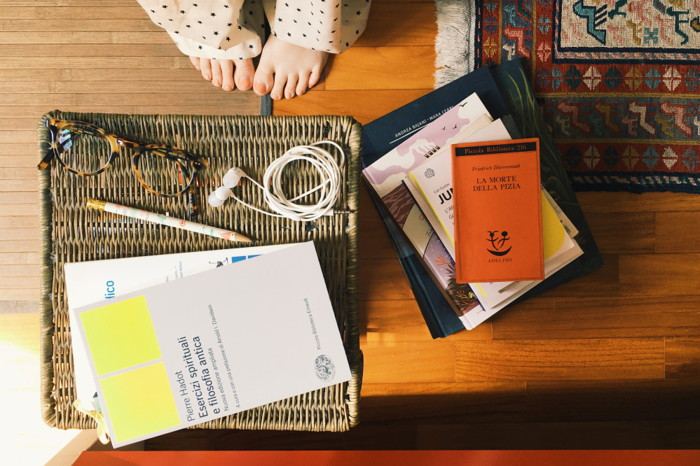 Partirò da quello che da più tempo occupa il posto d’onore sul mio sgabello-comodino: si tratta di Esercizi spirituali e filosofia antica di Pierre Hadot. Un saggio meraviglioso, arricchente, denso di concetti e informazioni. Continuo la lettura da molti mesi, non perché non mi stia piacendo ma perché questa sua “densità” lo rende adatto solo a determinati periodi.