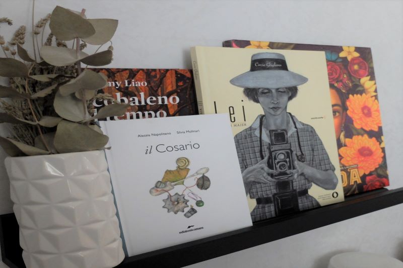 Tra gli albi illustrati che troneggiano sul comodino ci sono alcune delle chicche editoriali che custodisco gelosamente e che amo sfogliare e ammirare. Su questo piccolo altarino consacrato alla bellezza e alla poesia, ci sono titoli che ruotano e titoli che hanno un posto fisso. Al momento c’è la Frida meravigliosamente illustrata da Benjamin Lacombe (Rizzoli), Lei di Cinzia Ghigliano (Orecchio Acerbo), un gioiello di albo dedicato alla figura di Vivian Maier, fotografa che amo molto, L’arcobaleno del tempo una delle opere più belle di Jimmy Liao (Terre di mezzo), dedicata al cinema e Il cosario di Alessia Napolitano e Silvia Molinari (Edizioni Corsare),una piccola e delicata poesia illustrata che amo particolarmente e mi commuove sempre. E infine, un capolavoro di cartotecnica che ricama poesia e dà vita ad un personaggio che porto nel cuore, Jacominus Gainsborough in Ti aspetto di Rebecca Dautremer (Rizzoli).