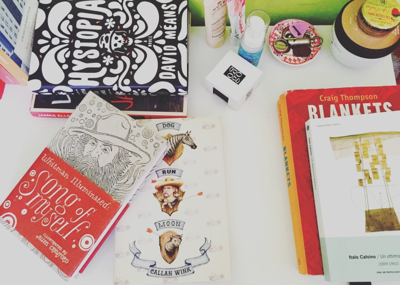 - Libri ancora da leggere: Dog. Run. Moon di Callan Wink. Credo che sarà il prossimo caso editoriale per cui ci entusiasmeremo qui in Italia. Lo credo ancor prima di averlo letto, perché quando gironzolavo per Powell’s, a Portland in Oregon, le sue atmosfere mi hanno fatto sognare un’America antica e nuova insieme, e mi hanno attratta terribilmente. Tra le pubblicazioni italiane, invece, segnalo Burned Children of America: ho ancora qualche racconto da finire e non voglio che finiscano.