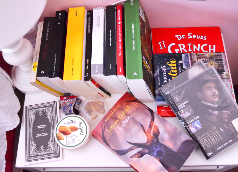 Lo spazio viene preso in prestito dai libri natalizi di Gabriele come Il Grinch (Mondadori) e I racconti di Natale di Charles Dickens (Gribaudo) che a solo due anni ha già qualche libro sulla sua fedina da bibliofilo. Ora in lettura ho LaRose di Louise Erdirch (Feltrinelli Editore) e presto spero che anche Joan Didion (Il Saggiatore) si accomodi sul mio comodino strapieno, sempre in attesa di nuovi consigli, nuovi autori; il mio comodino è ancora in costruzione e non ho la più pallida idea di dove mi porterà.