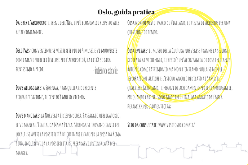 Oslo è una città giovane, provinciale la definisce Manganelli, «più impegnata ad essere attuale di quanto accada alla Norvegia». Mancherà di quell’atmosfera regale che contraddistinguerà le due vicine sorelle, Stoccolma e Copenaghen, ma è pur sempre una città nordica che coniuga modernità, efficienza e tradizione.