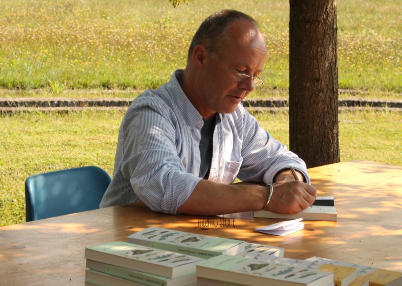 Ha un piccolo binocolo al collo, potrebbe confondersi con qualsiasi visitatore della riserva. Se avesse potuto sicuramente si sarebbe equipaggiato persino di retino. Gli occhi azzurri tradiscono le sue origini nordiche, puntano al di sopra delle nostre tesse quasi cercasse un reticolato di segni. Fredrik Sjöberg aspetta i lettori e i curiosi alla riserva naturale di Bosco Fontana, un piccolo polmone verde poco distante dalla città, una piccola isola come quella abitata dallo scrittore, Runmarö, nell’arcipelago svedese.