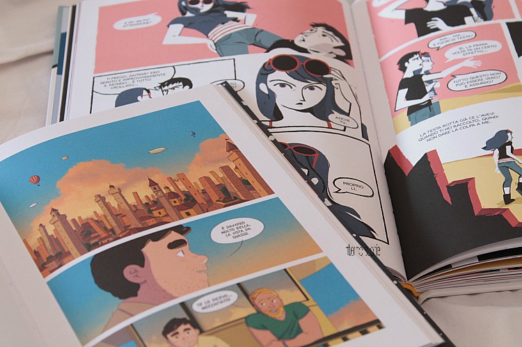 Un colore pieno e tratti che mi ricordano un po’ gli anni Ottanta e il Giappone, forse i cartoni che trasmettevano il pomeriggio. Poi a pagina 141 mi ha colpita un particolare. I libri che Antonio tiene sul comodino nella casa di famiglia ritratti nelle edizioni correnti e passate. Così come la naturalezza di inserimento delle conversazioni telefoniche, messaggistica in primis, divenute la nostra quotidianità. Ma è un aspetto che accomuna entrambi i fumetti.